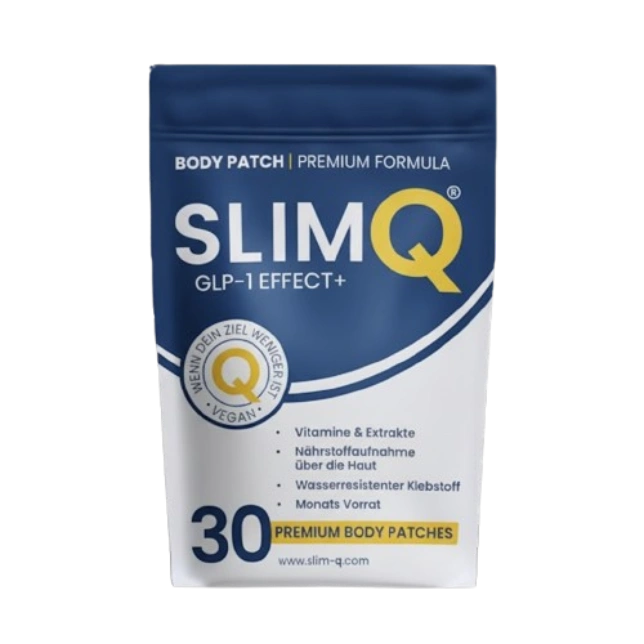 SlimQ ist ein transdermaler Patch, der Nährstoffe über die Haut freisetzt. Er wird auf saubere, trockene Haut aufgeklebt, bleibt dort für bis zu 8 Stunden und wird täglich gewechselt. Die Inhaltsstoffe umfassen pflanzenbasierte Extrakte, einen Vitamin-B-Komplex sowie L-Glutamin und Chrompicolat. SlimQ betont, dass es sich um ein Nahrungsergänzungsmittel handelt und nicht um ein Medikament oder GLP-1-Syntheseprodukt.